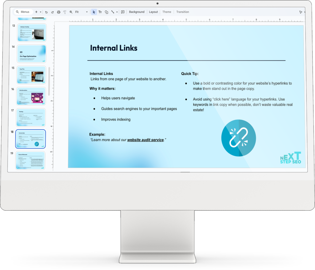 We know SEO can feel overwhelming—but it doesn’t have to be. At Next Step SEO, we will create a tailored plan that gives you the tools, knowledge, and roadmap to achieve sustainable growth.